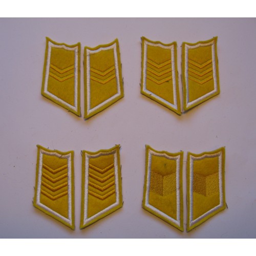 Vääpeli. Ylikersantti. Kersantti. Alikersantti. Kauluslaatat ovat sota-aikaisia malleja..