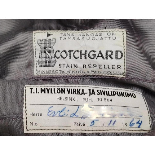 Jalkaväki.Kangas on diagonaalia. Takissa harvinaiset ”tinanapit” Valmistettu 1941. K..